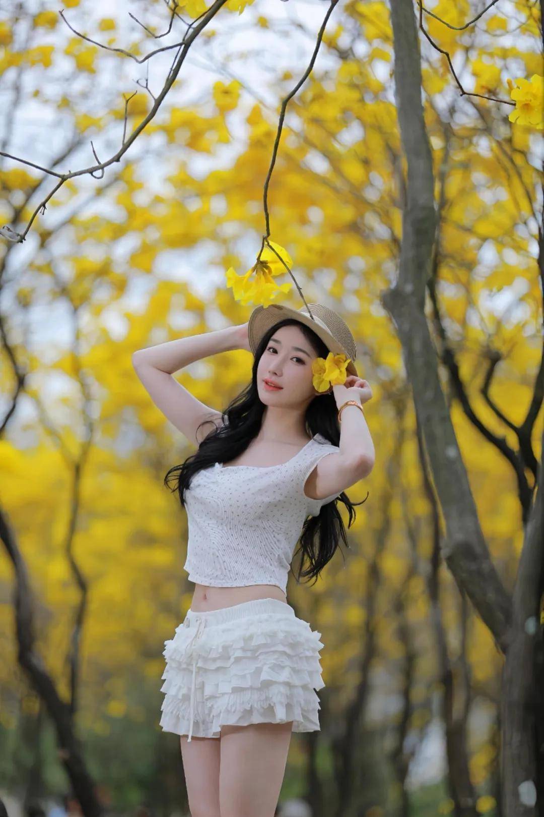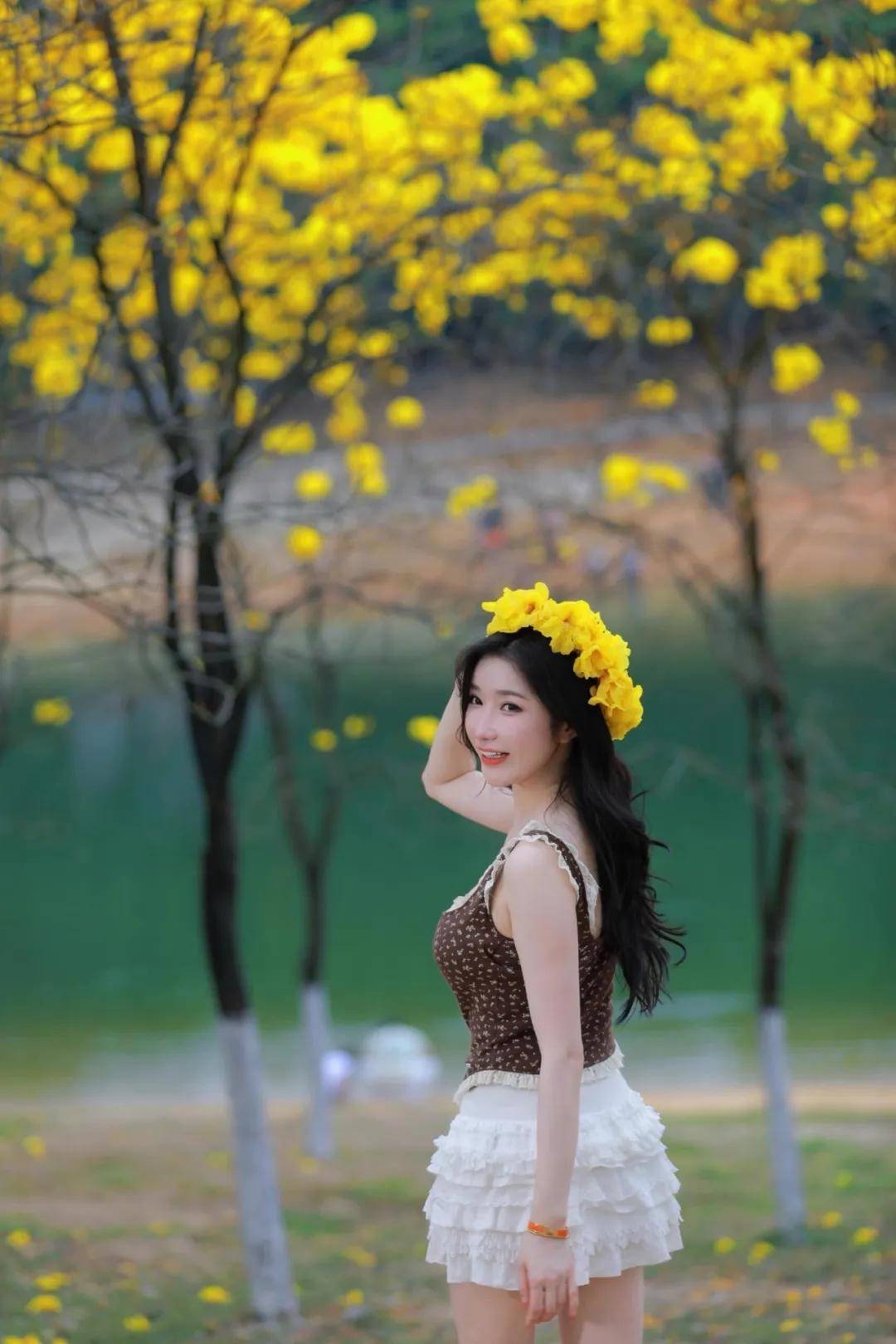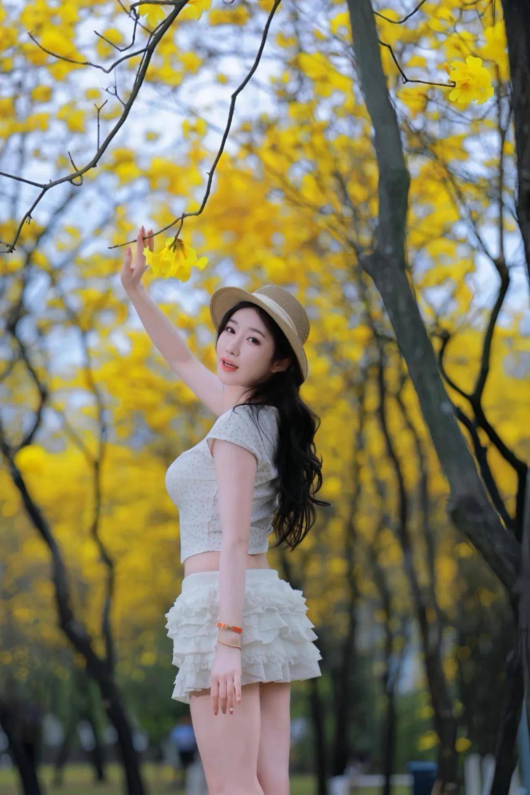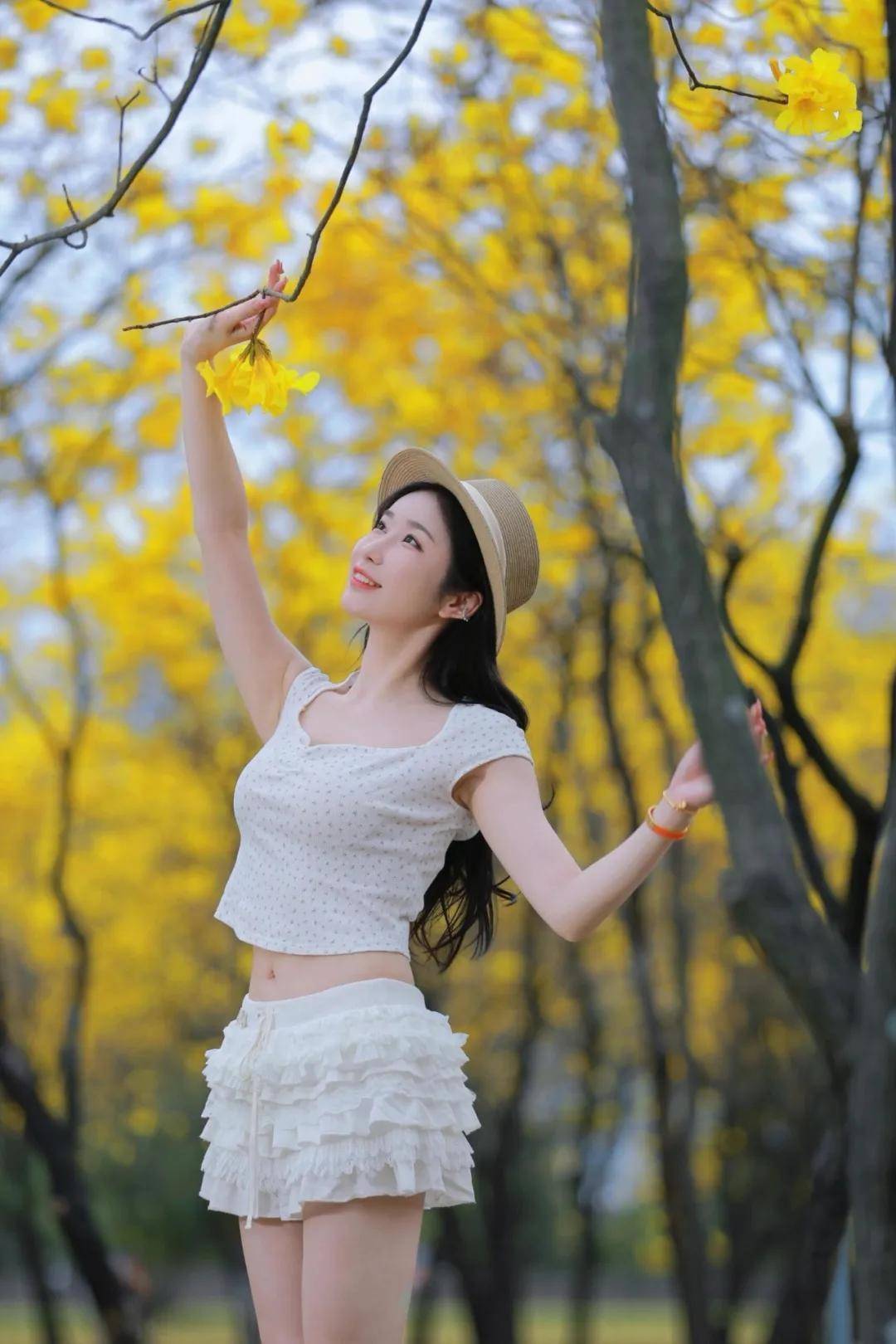 侧身站在两棵黄风铃树中间,一只手轻轻举起帽子,另一只手拿着一朵风铃花,身体放松,脸上带着温柔的笑。风铃花拍照这样摆,大方又温柔,拍出来漂亮有气质,花人美轻松出片,发朋友圈能出圈。