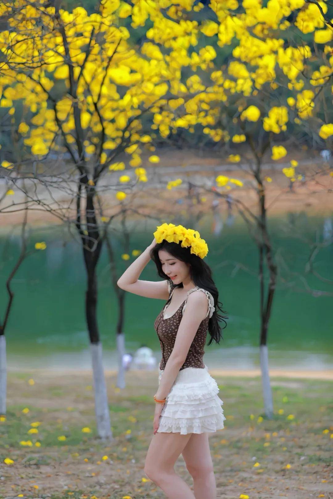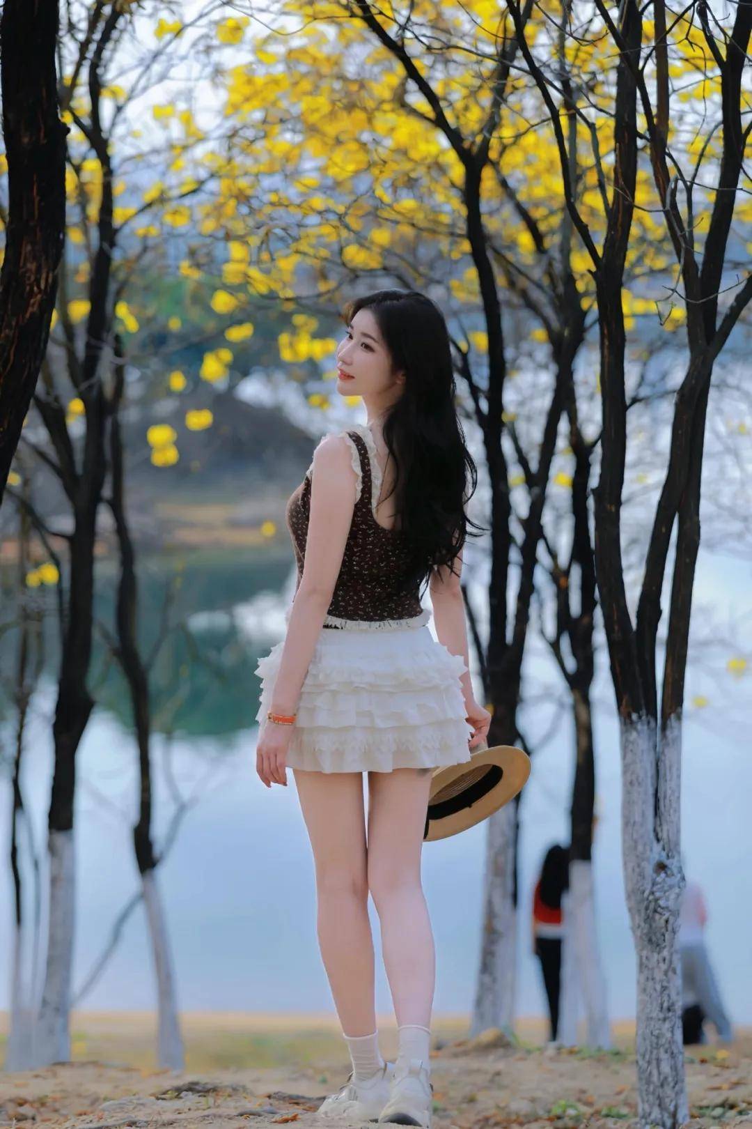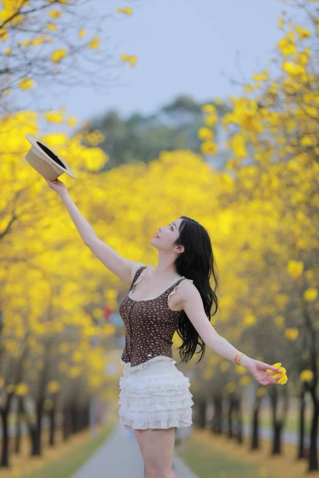 侧身跨出一只脚,假装走在黄风铃花树下,脚步放松,低头带着微笑,神情温柔。这个拍照姿势很灵动,风铃花拍照这样拍,好看又自然,花人美超出片,温柔又有气质,发朋友圈很合适。
