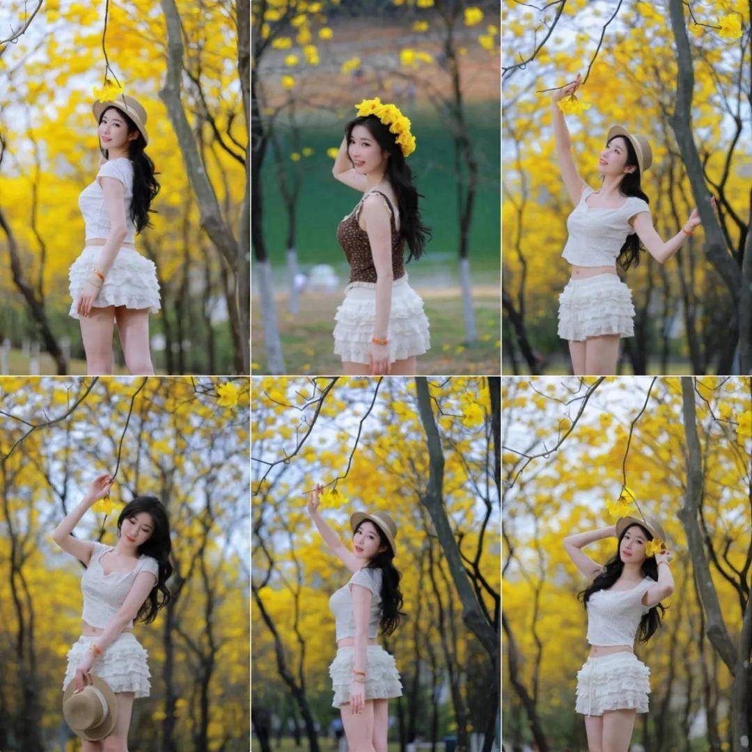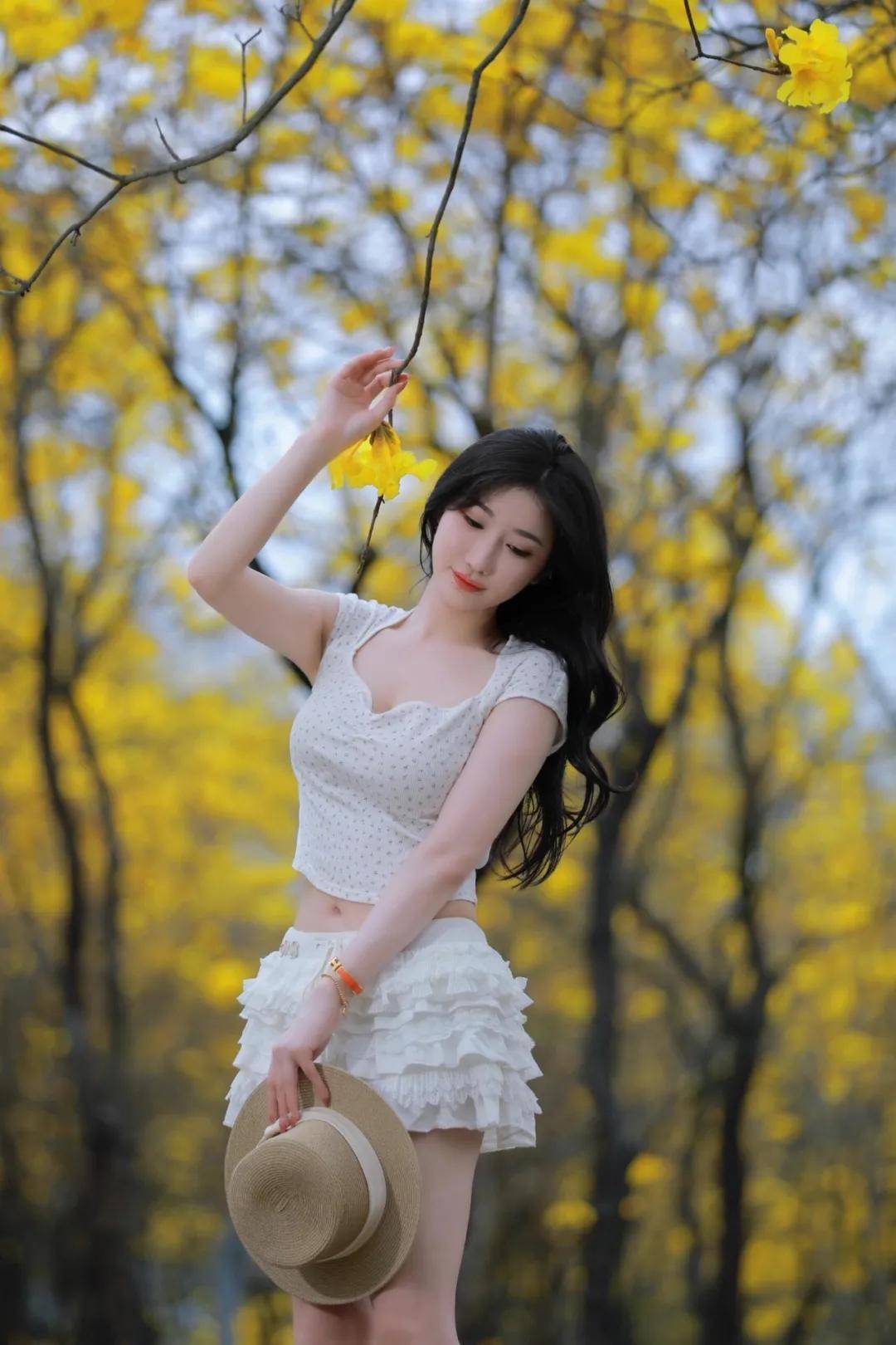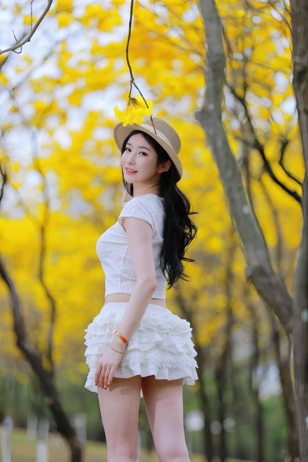 侧身跨出一只脚,假装走在黄风铃花树下,脚步放松,低头带着微笑,神情温柔。这个拍照姿势很灵动,风铃花拍照这样拍,好看又自然,花人美超出片,温柔又有气质,发朋友圈很合适。