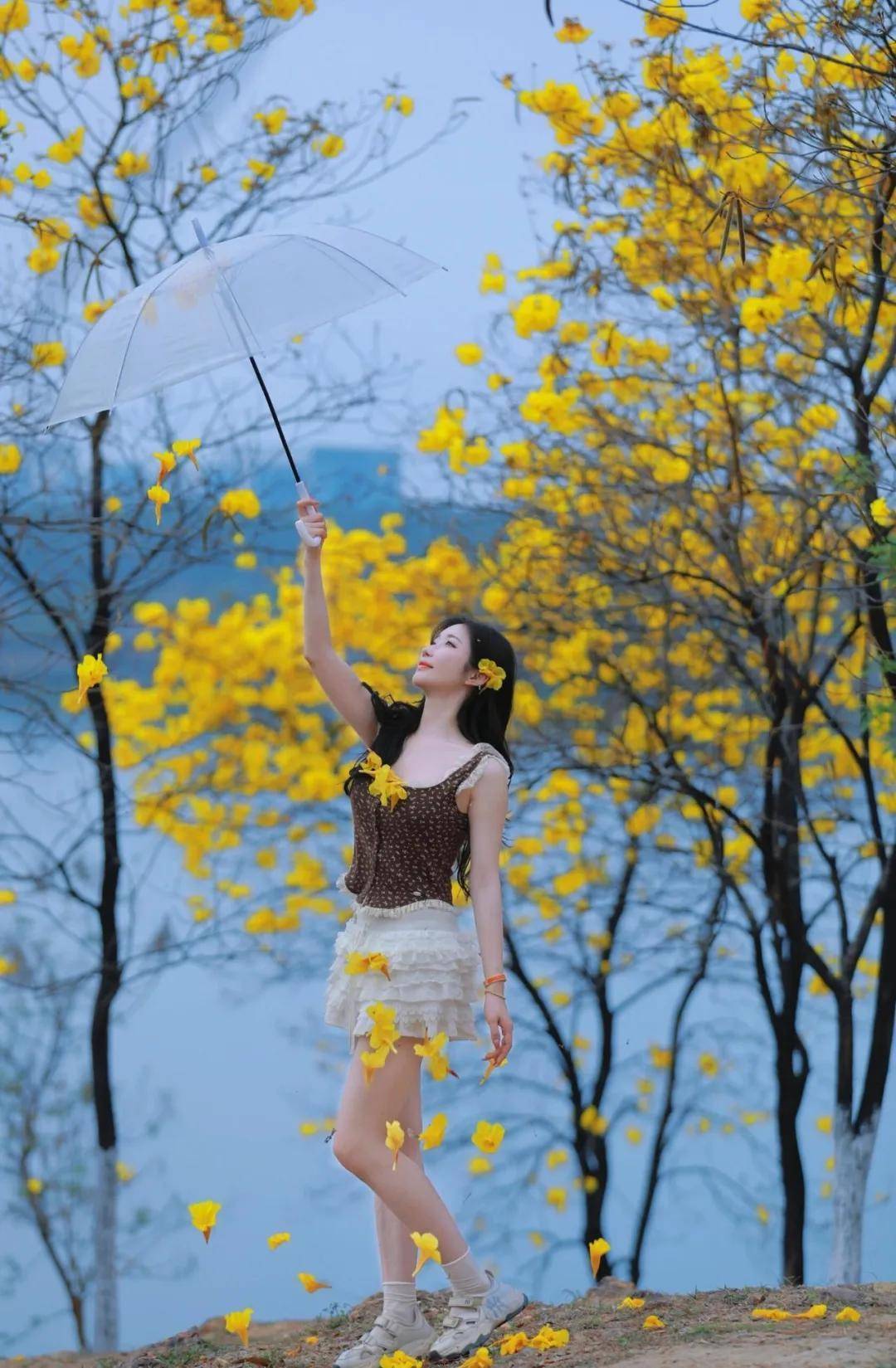 侧身站在黄风铃花树下,手里举一把小伞,不用完全挡住自己,慢慢仰头,脸上带着微笑,对着镜头拍摄。风铃花拍照这样摆,温柔又有画面感,拍出来好看又漂亮,花人美很出片,新手也能轻松拍。